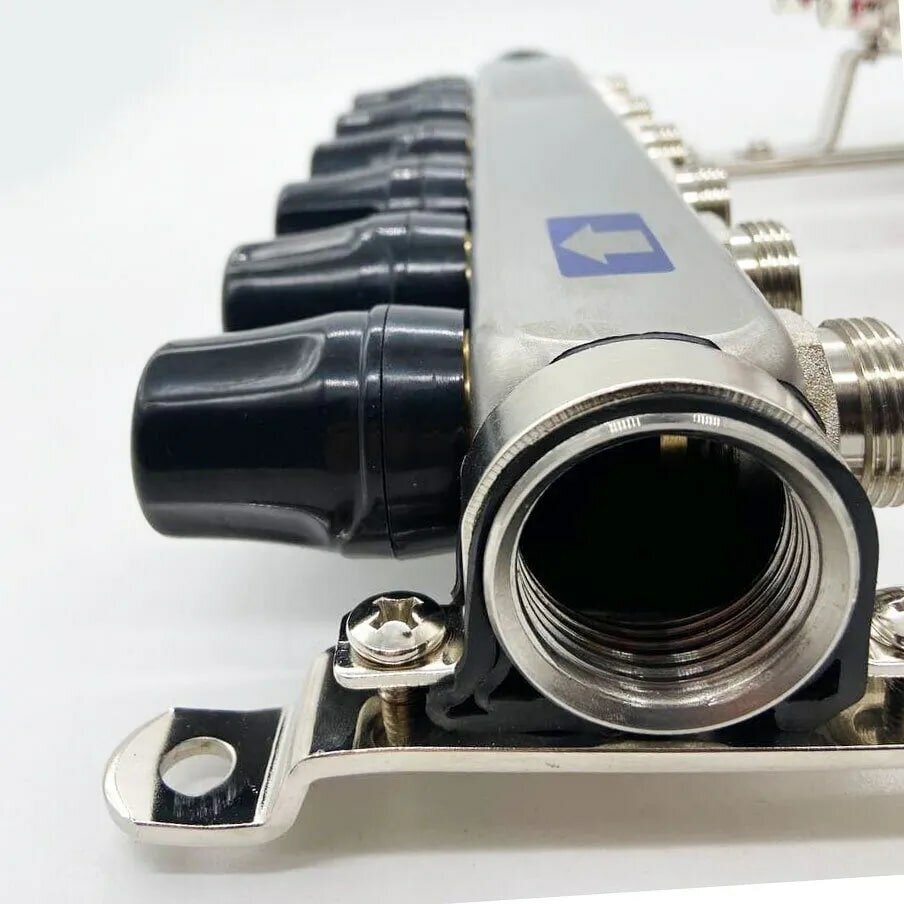 Detailed equipment: Pressure manifold with shut-off valves - 1 pc., return manifold with thermostatic valves - 1 pc., drain valves - 2 pcs., all-metal bracket - 2 pcs., plugs - 2 pcs.