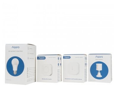 Ecosystem: Aqara Home, Yandex Smart Home, equipment: wireless button, motion sensor, temperature and humidity sensor, bulb, number in the set: 4 pcs., device connection type: wireless, communication protocol: Zig