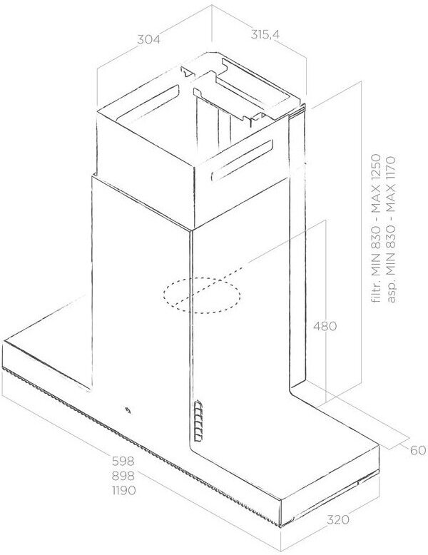 Form factor: T-shaped, width: 120 cm, depth: 32 cm, operating modes: exhaust, maximum productivity: 1200 m³/hour, filter: grease, control type: electronic, lighting type: LED, maximum noise level: 5