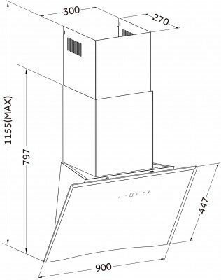 Form factor: inclined, width: 90 cm, depth: 33.50 cm, operating modes: exhaust / circulation, maximum productivity: 1000 m³/hour, filter: grease, control type: electronic, lighting type: LED, maximum