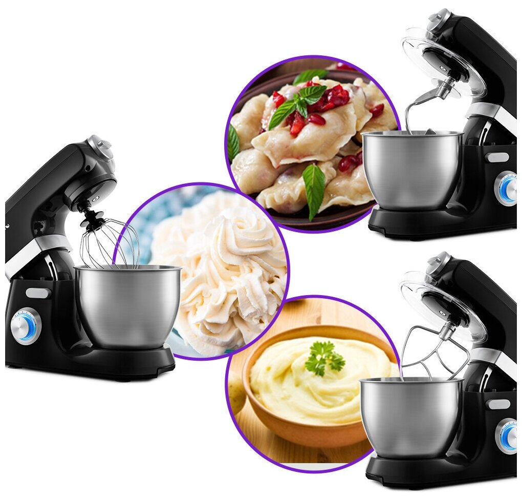 Type: planetary stationary, power: 1100 W, attachments: whisk for whipping, hooks for kneading dough, bowl material: stainless steel, bowl volume: 5 l, body material: plastic, additional modes: pulse �