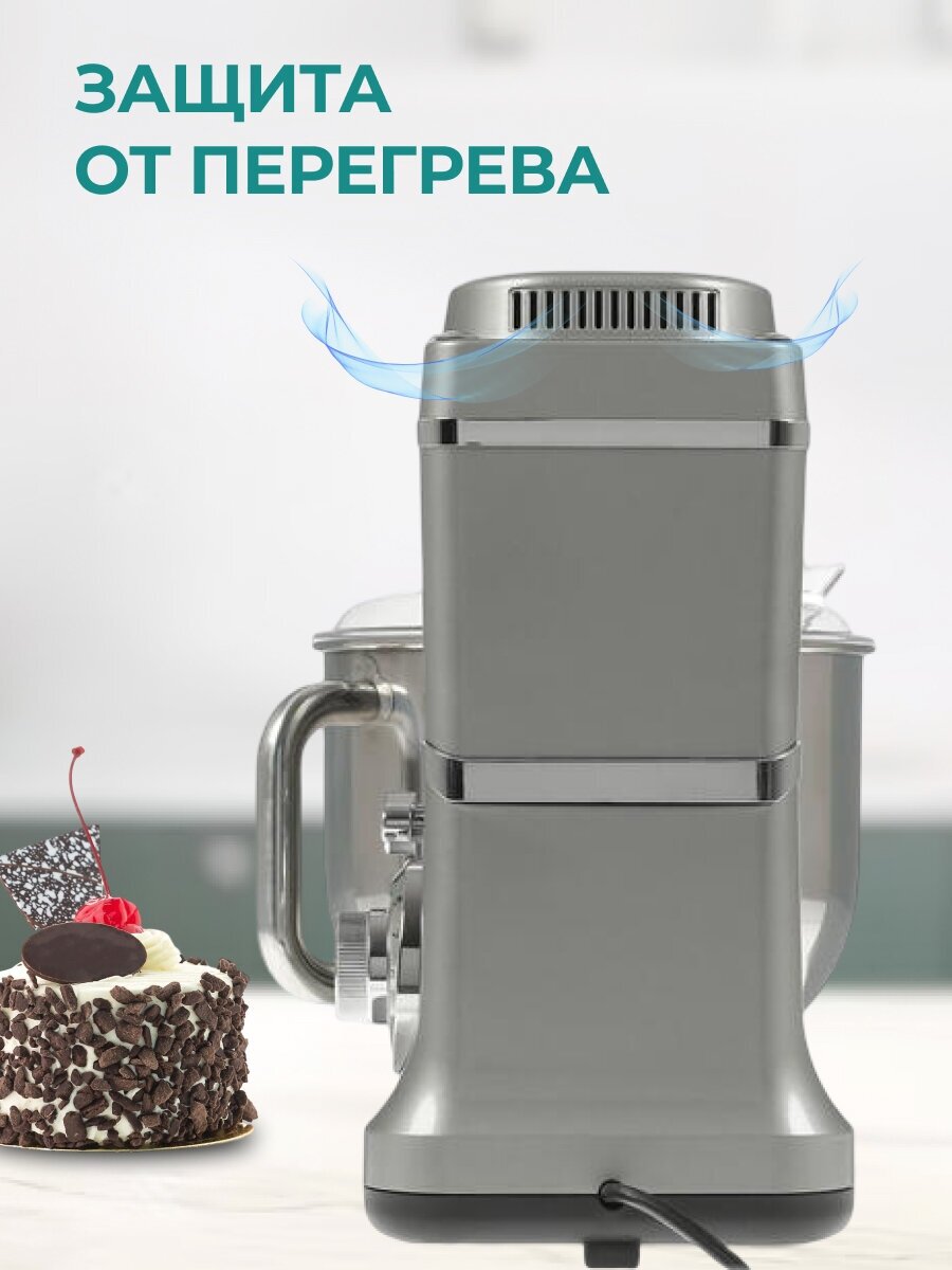 Type: stationary, power: 1200 W, attachments: whisk for whipping, hooks for kneading dough, bowl material: stainless steel, bowl volume: 6 l, body material: plastic, design features: protective cover on the bowl