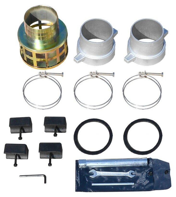 Inlet/outlet pipe - 2 pcs, gasket - 2 pcs, union nut - 2 pcs, clamp - 3 pcs, filter, spark plug wrench