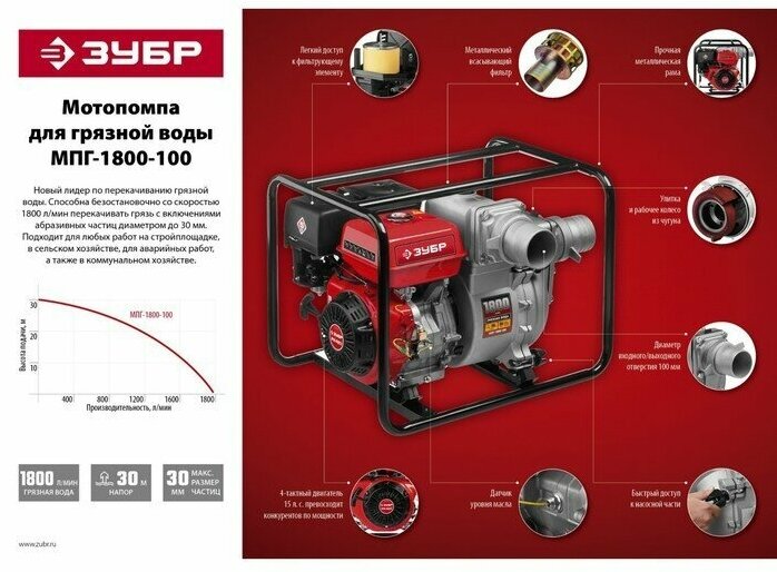 Water quality: medium contaminated, maximum productivity: 1800 l/min, outlet diameter: 100 mm, inlet diameter: 100 mm, engine volume: 420 cm³, engine stroke: 4-stroke, suction height