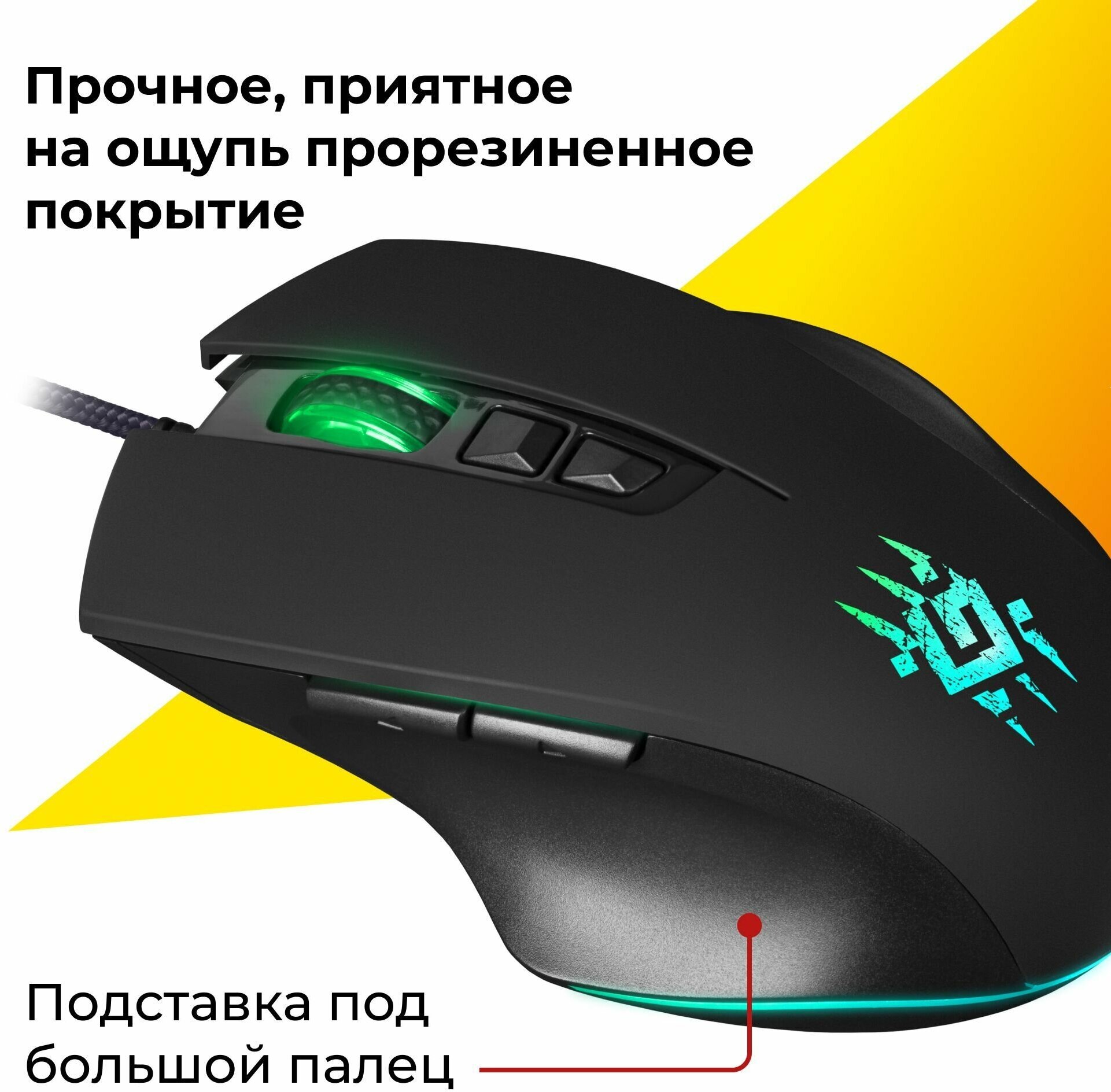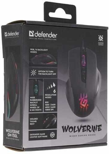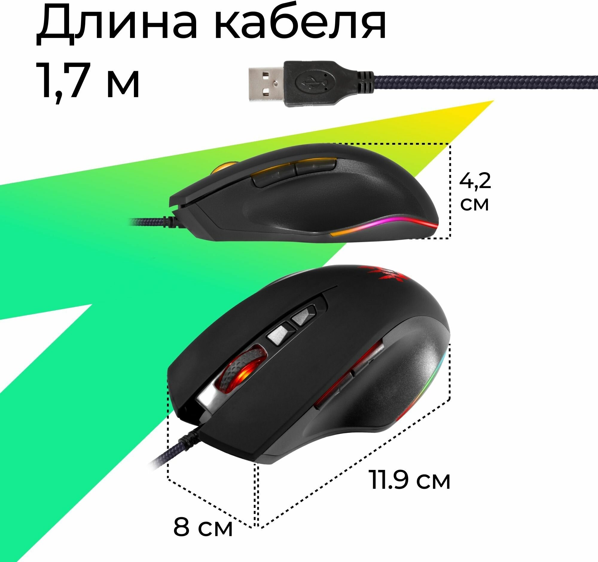 RGB backlight - 14 modes; mouse sensor resolution, DPI 800 / 1600 / 2400 / 4800 / 6400 / 12800; ferrite interference filter; wide rubberized scroll wheel 8 mm wide with backlight; frame rate 7000