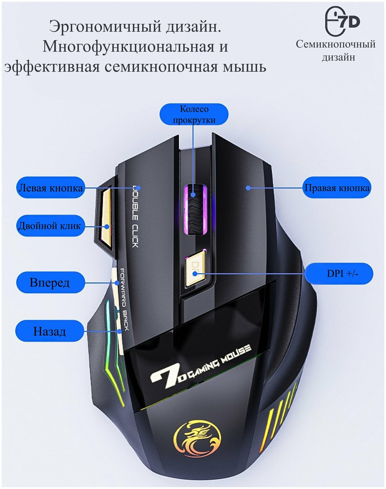 Gaming, wireless. Rechargeable, for computer, laptop, computer with RGB backlight, 7 buttons, DPI 1200/2400/3200 USB 2.4Ghz