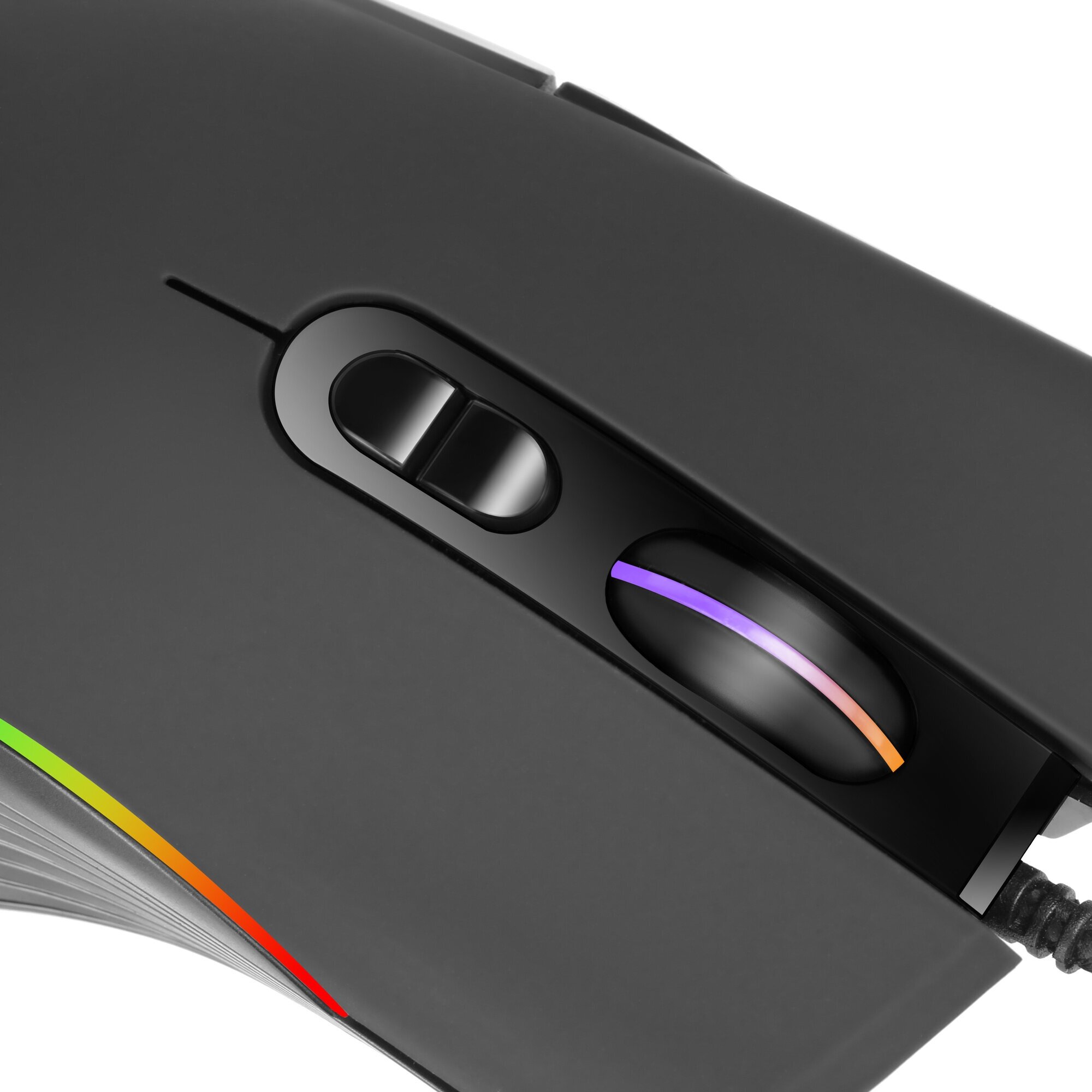 Gaming mouse with RGB lighting, durable braided cable, soft-touch coating, ribbed side inserts