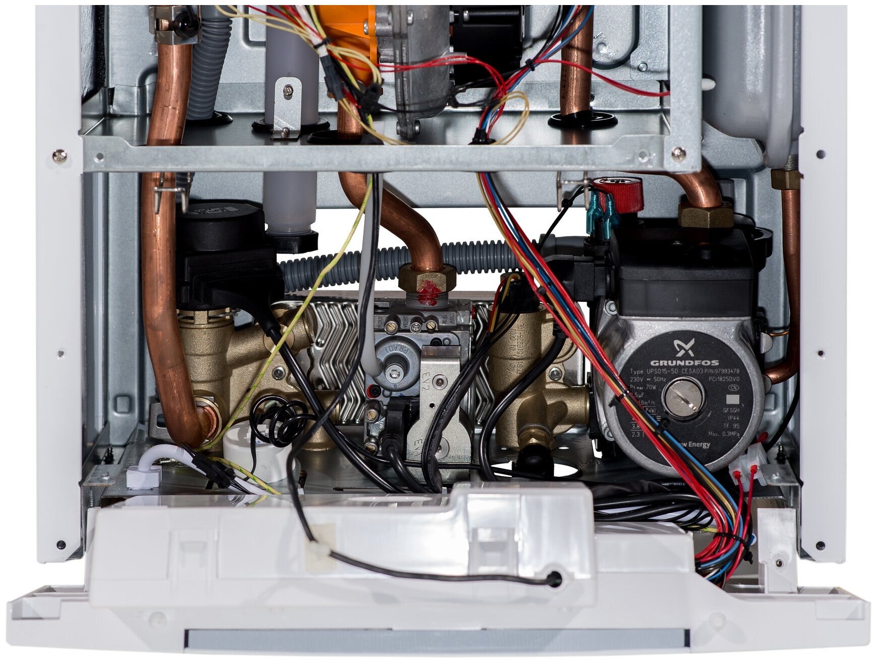 Air vent, built-in expansion tank, built-in circulation pump, pressure gauge, safety valve, connector for external control, thermometer, water filter