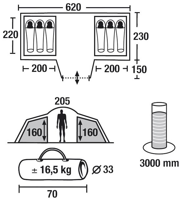 Purpose: camping, number of places: 4, features: UV protection, ventilation holes, wind / snow skirt, inside pockets, inner tent, canopy, taped seams, assembly type: outer frame