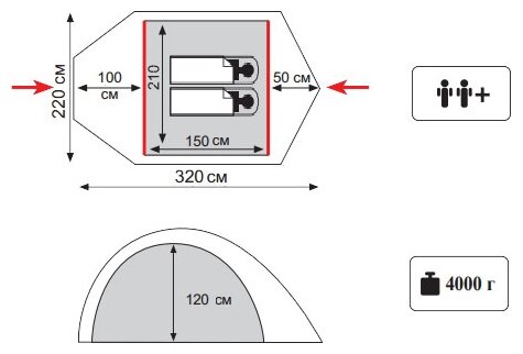Purpose: camping, number of places: 4, features: UV protection, ventilation holes, wind / snow skirt, inside pockets, inner tent, canopy, taped seams, assembly type: outer frame