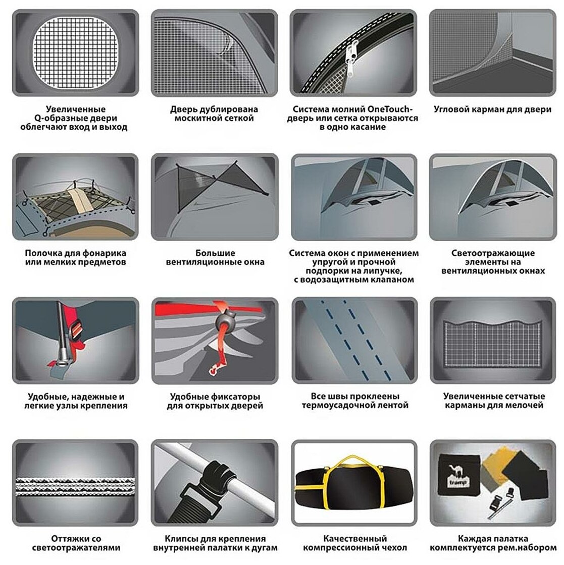 Purpose: trekking, number of seats: 4, features: UV protection, ventilation holes, inner pockets, inner tent, canopy, fireproof impregnation, taped seams, build type: inner frame, waterproof