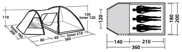 Purpose: trekking, number of seats: 3, features: ventilation holes, inner pockets, inner tent, windows, taped seams, reinforced corners, assembly type: outer frame, awning water resistance: 1500 mm in