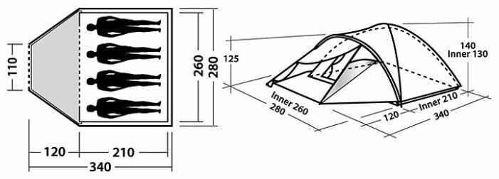 Purpose: trekking, number of seats: 4, features: ventilation holes, inner pockets, inner tent, windows, taped seams, reinforced corners, build type: outer frame, tent water resistance: 3000 mm