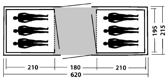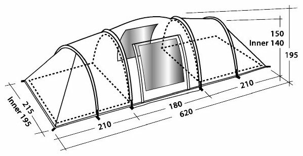 Purpose: camping, number of places: 6, features: air vents, inner pockets, inner tent, canopy, fireproof impregnation, taped seams, reinforced corners, assembly type: outer frame, water