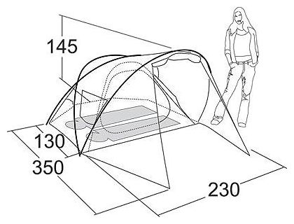 Purpose: camping, number of places: 4, features: UV protection, ventilation holes, wind / snow skirt, inside pockets, inner tent, canopy, taped seams, assembly type: outer frame
