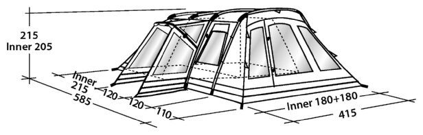 2 bedrooms 3+3, 1 living room; bag with tent 38x115 weight 29kg, stands 30x105cm weight 29.6kg