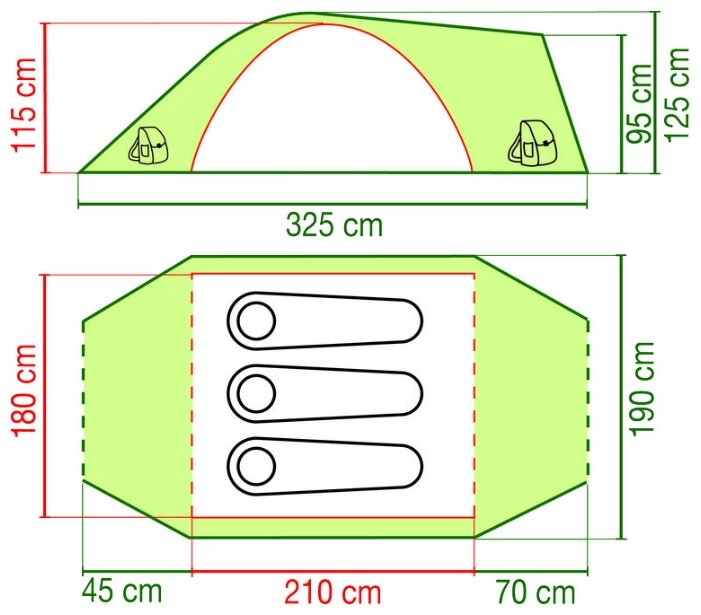 Purpose: camping, number of places: 3, features: air vents, inner pockets, inner tent, canopy, windows, taped seams, assembly type: outer frame, awning water resistance: 2000 mm w.c. st., count