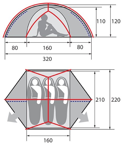 Purpose: trekking, number of places: 3, features: air vents, inner tent, taped seams, reinforced corners, build type: outer frame, awning water resistance: 3000 mm w.c. Art., number of rooms: 1