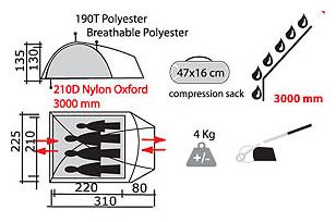 Purpose: camping, number of places: 4, features: UV protection, ventilation holes, wind / snow skirt, inside pockets, inner tent, canopy, taped seams, assembly type: outer frame