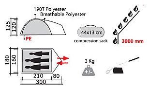 Purpose: trekking, number of places: 3, features: ventilation holes, inner tent, taped seams, assembly type: inner frame, awning water resistance: 3000 mm w.c. Art., number of rooms: 1, number