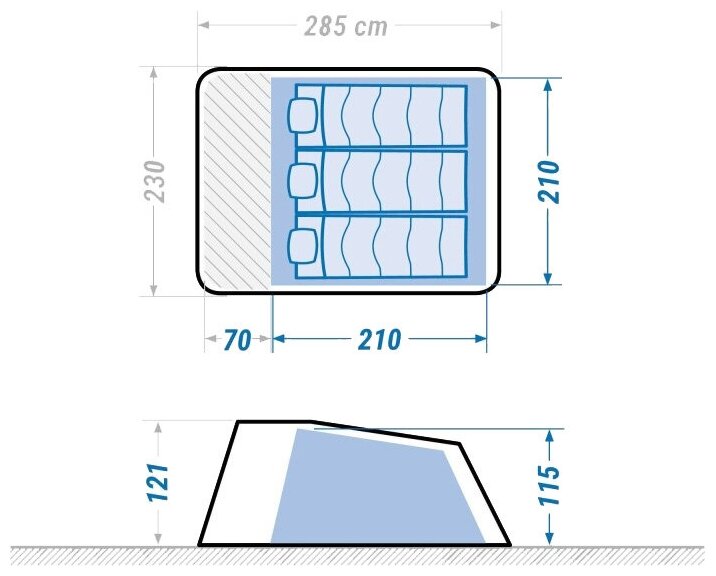 Purpose: camping, number of places: 3, features: UV protection, ventilation holes, inner tent, taped seams, assembly type: quick assembly, outer frame, awning water resistance: 2000 mm w.c. art., quantities