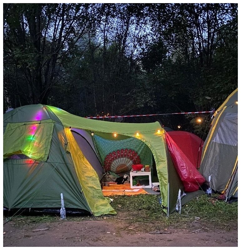 The possibility of attaching a flashlight, pegs, mosquito net, storm wires
