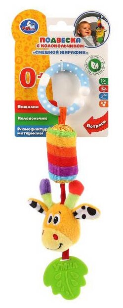 Type: hanging toy, effects: sound, educational elements: bell, squeaker, teether, tactile inserts, material: plastic, textile