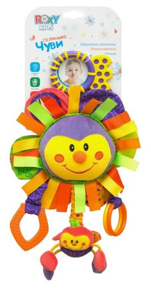 Type: hanging toy, effects: sound, educational elements: mirror, teether, tactile inserts, rustling and crispy elements, material: plastic, textile