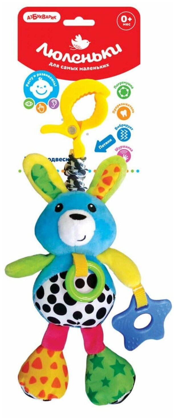 Type: hanging toy, effects: vibration, sound, educational elements: rattle, teether, material: plastic, textile