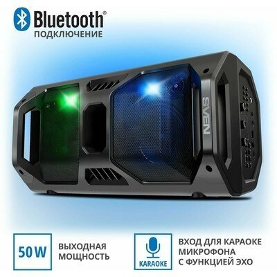 Type: mono, total power: 50 W, wireless: Bluetooth, connectors and interfaces: 3.5 mm, 6.3 mm, USB, microUSB, features: waterproof case, built-in microphone HandsFree function, microSD support, lighting effects