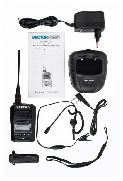 Type: walkie-talkie, number of channels: 77 pcs., transmitter power: 5 W, frequency range: LPD, PMR, frequency range, min.: 433.08 MHz, range: 12 km, features: CTCSS, DCS, voice activation via VOX headset , power switching