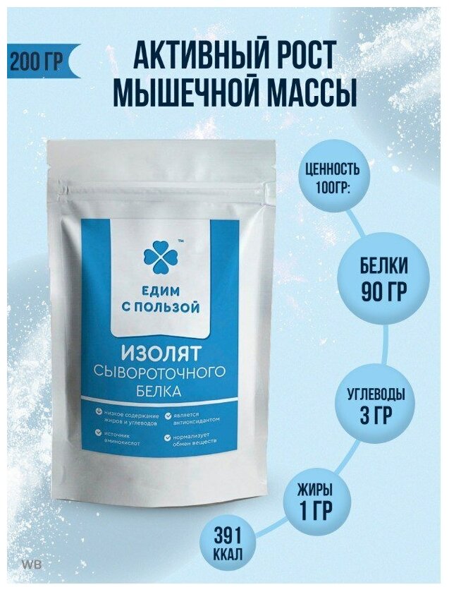 Nutritional value per 100 g: proteins not less than 90 g; fats not more than 1 g; carbohydrates 3 g, energy value 381 kcal; composition: whey protein isolate