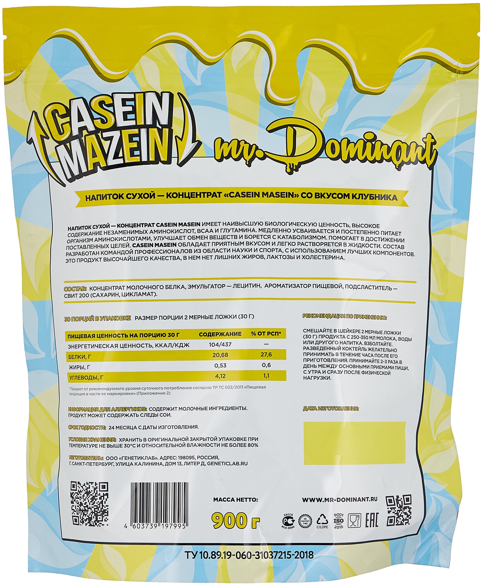 Type: multicomponent, release form: powder, protein content per 100 g: 20.80 g