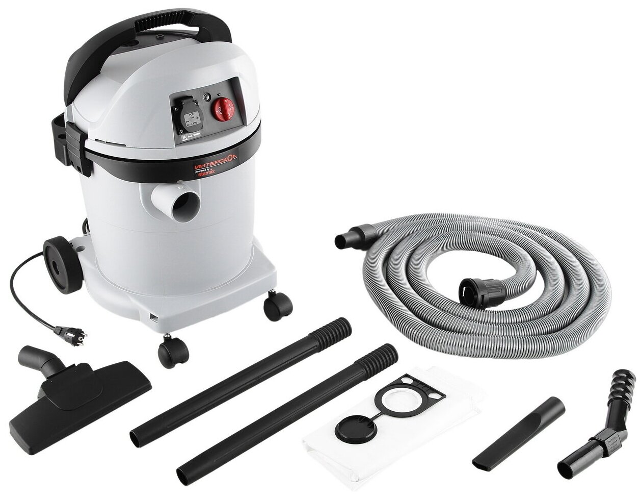 Type: professional vacuum cleaner, cleaning type: wet, dry, power: 1200 W, dust container type: container, bag, tank / dust container volume: 32 l, built-in socket, dust class: M, filter cleaning system: automatic, flow