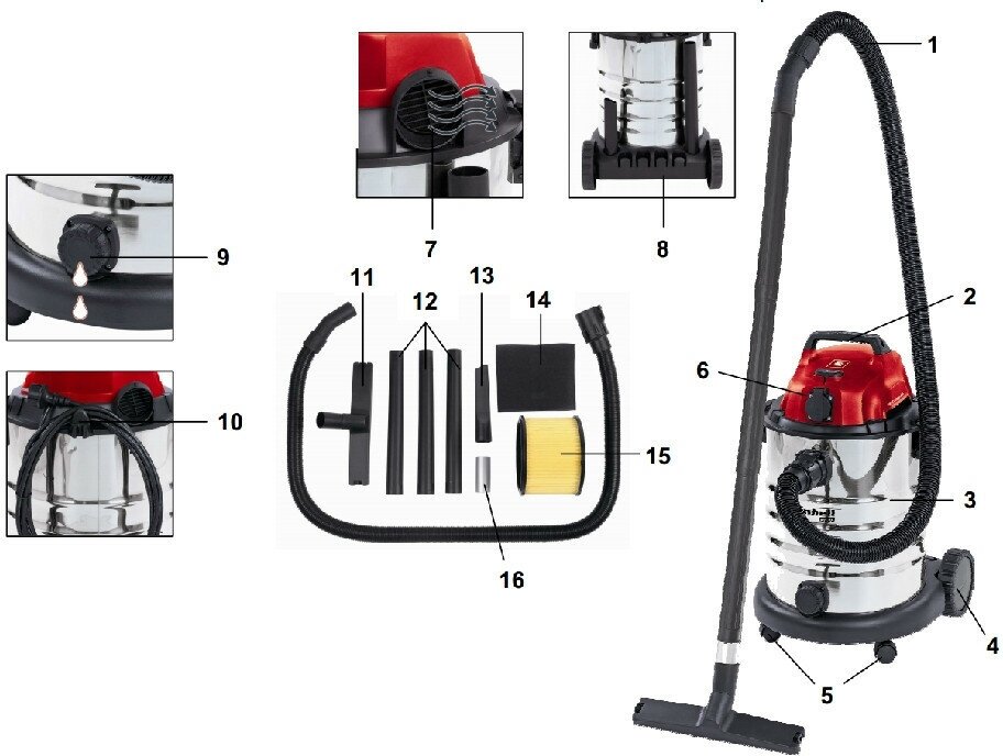 Type: professional vacuum cleaner, cleaning type: wet, dry, power: 1500 W, tank/dust container volume: 30 l, built-in socket, hose length: 2.50 m, hose diameter: 36 mm, built-in socket power: 2000 W, cable length: 2.50 m, ve