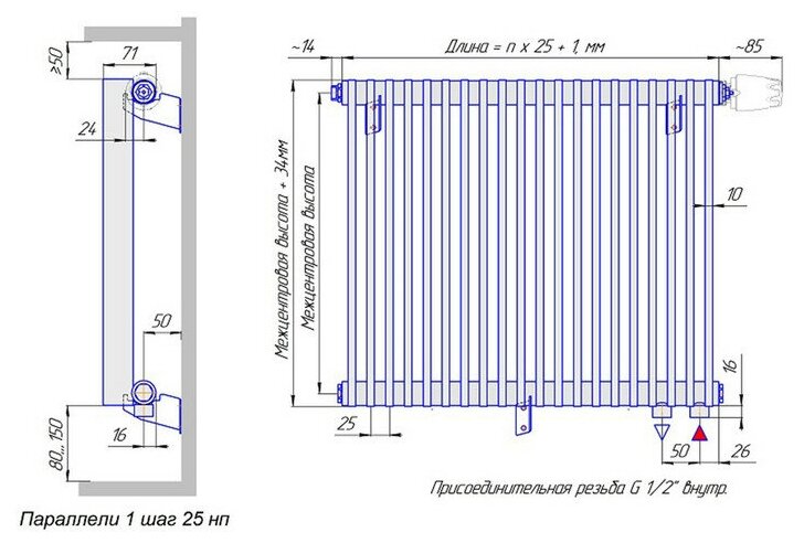 Material: steel, construction: wall-mounted, spacing: 50 mm, thickness: 70 mm, type: tubular