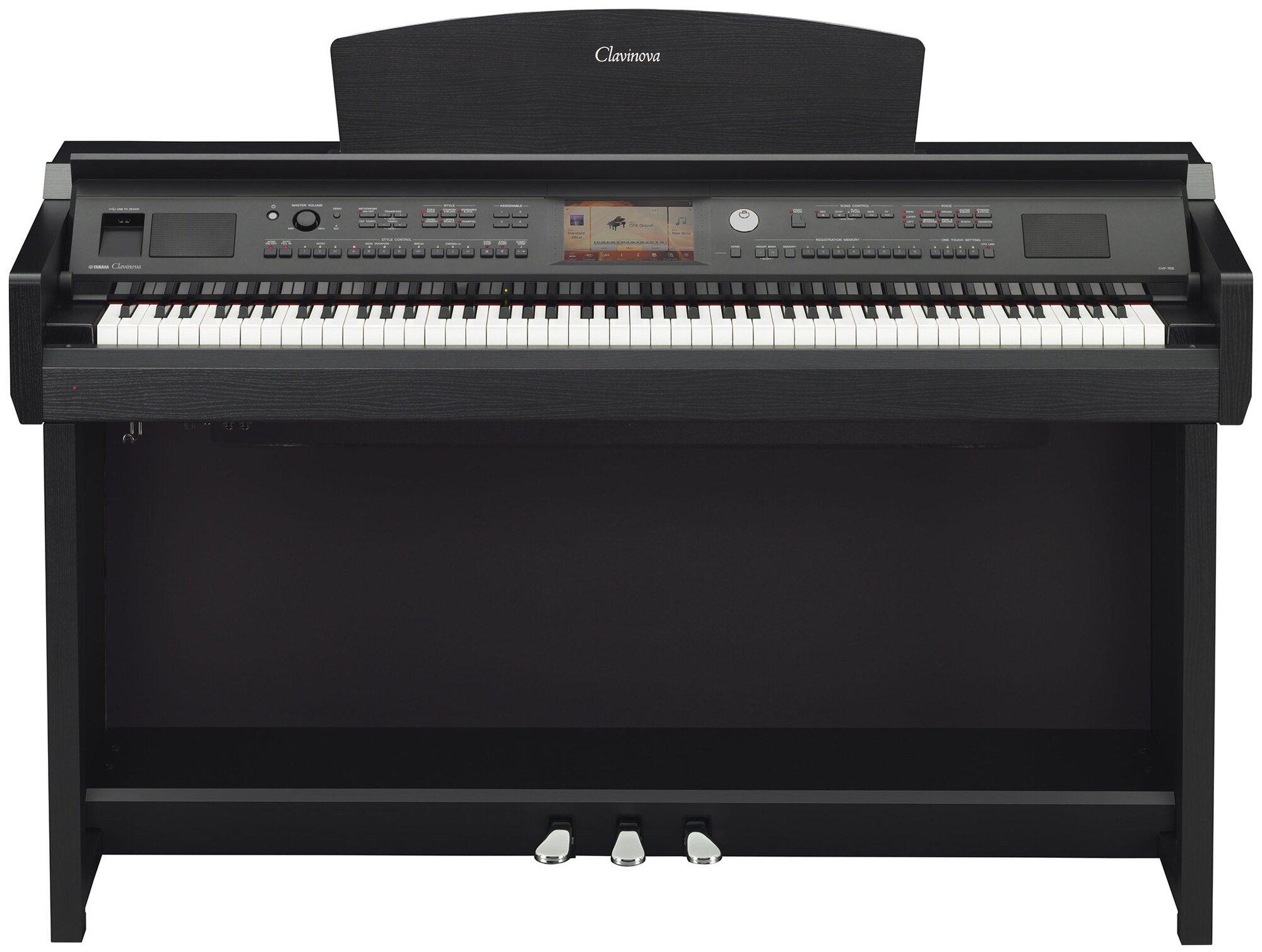 Number of keys: 88, key size: full size, keyboard stiffness: weighted, hammer action, keyboard cover, backlit keys, touch screen, pedals: built-in, left una corda pedal, right damper