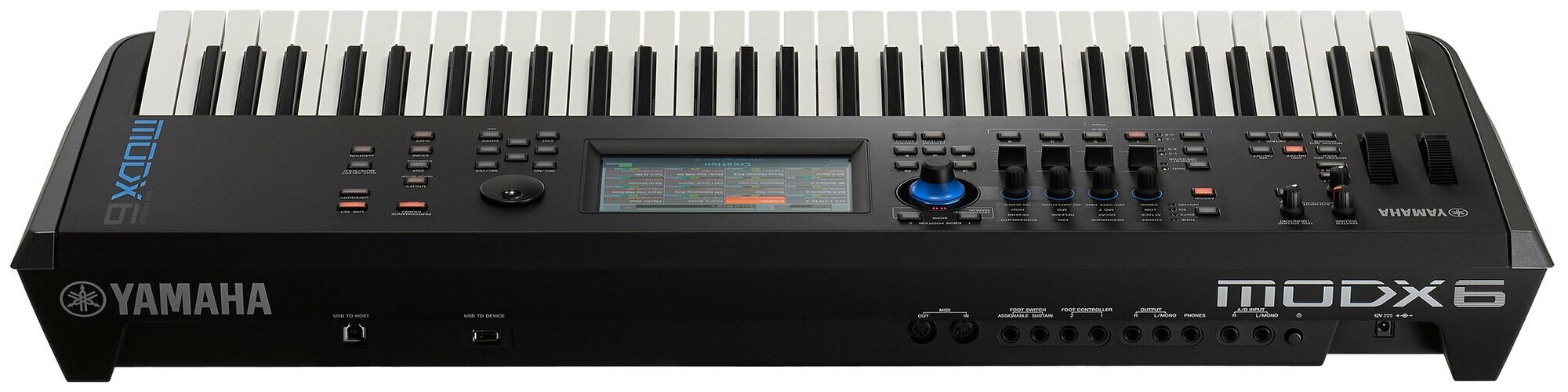 Number of keys: 61, key size: full-size, keyboard hardness: semi-weighted, touchscreen, pedals: plug-in, pitch bend controller, modulation controller, body: compact, multi-theme