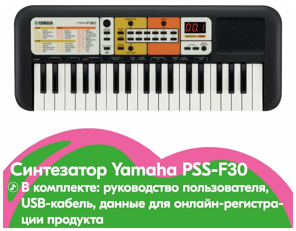Number of keys: 37, key size: small, keyboard hardness: unweighted, pedals: no, body: compact, multi-timbral: 1, auto-off, metronome, transposition, headphone output, 3.5 m
