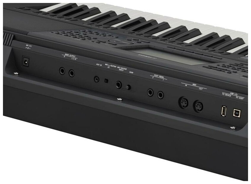 Number of keys: 61, key size: full size, display, pedals: pluggable, body: compact, auto accompaniment, arpeggiator, song recording, metronome, reverb, transposition, USB Type A, USB Type B, MIDI in, output