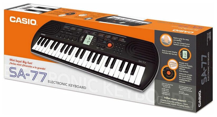 Number of keys: 44, key size: small, keyboard hardness: unweighted, display, pedals: no, body: compact, auto accompaniment, learning, headphone output, built-in speaker system,
