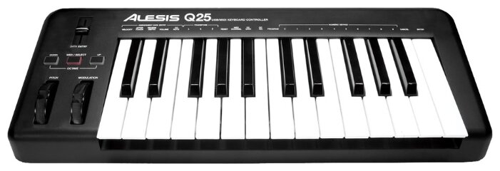Number of keys: 25, key size: full-size, keyboard firmness: unweighted, pedals: plug-in, pitch bend controller, modulation controller, body: compact, keyboard sensitivity to
