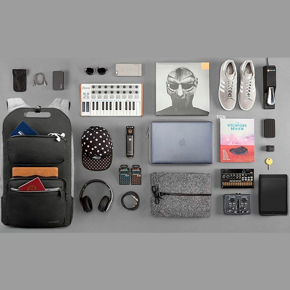 3 hidden zipped pockets, drawstring mesh pouch for bottles and umbrellas, glasses holder, external USB port