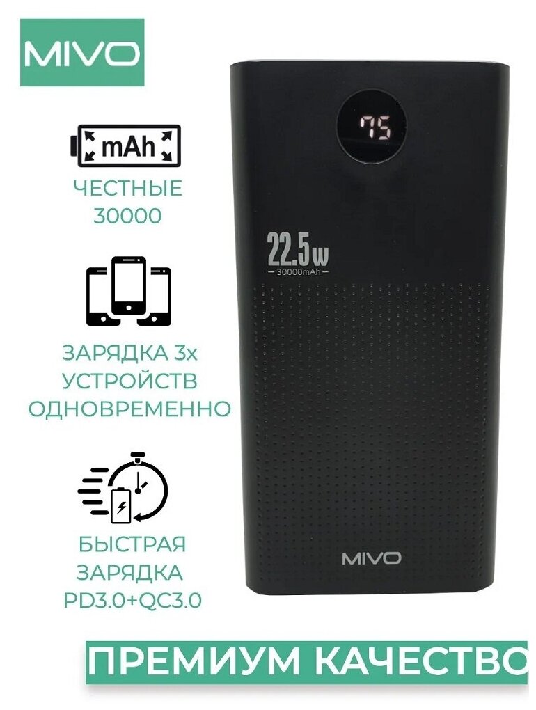 Capacity: 30000 mAh, compatibility: fast charging, universal, max. output current: 5A, features: Power Delivery, Quick Charge