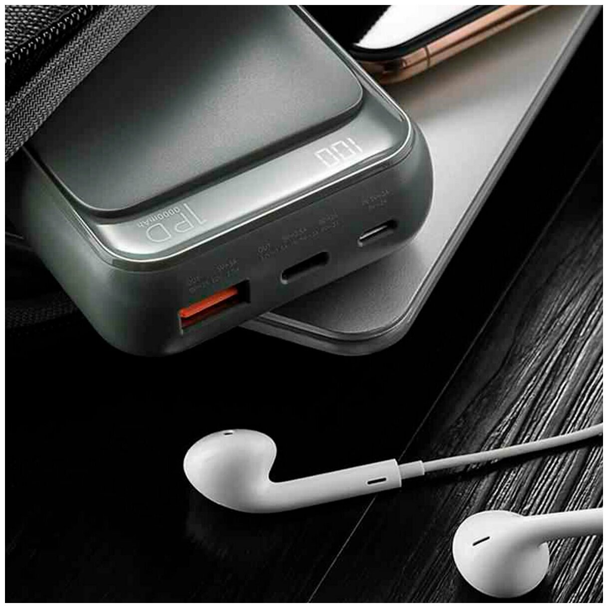 Capacity: 10000 mAh, compatibility: fast charging, max. output current: 3A, weight: 200g