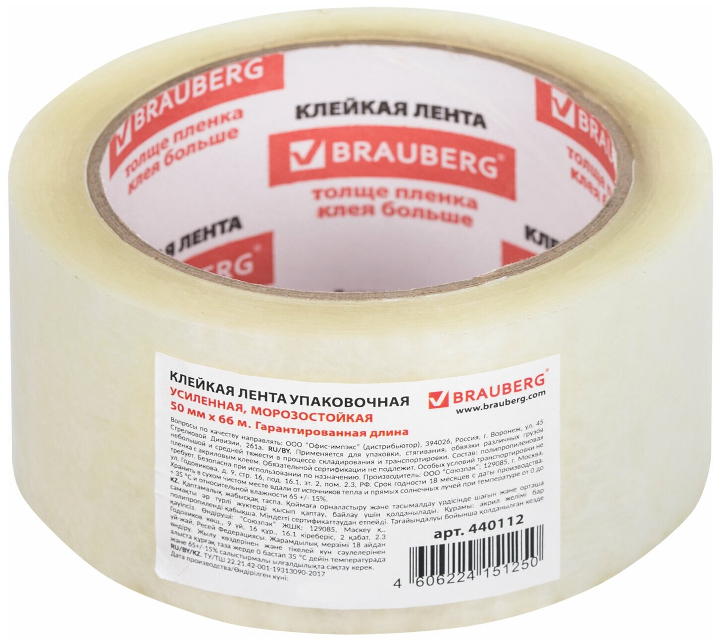 Adhesive packing tape 50 mm x 66 m, transparent, REINFORCED, FROST-RESISTANT, thickness 50 microns, BRAUBERG, 440112