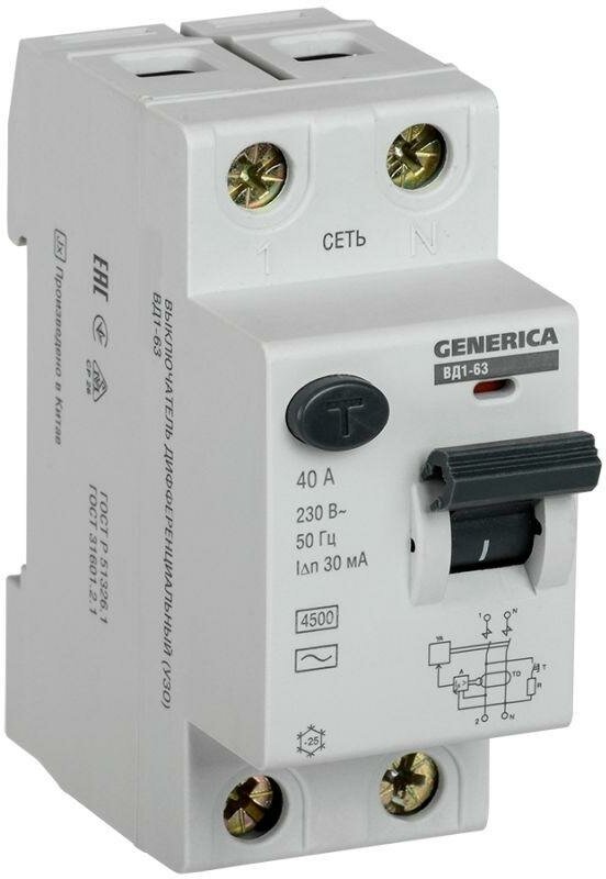 Differential current RCD 2p 40A 30mA type AC VD1-63 GENERICA IEC MDV15-2-040-030