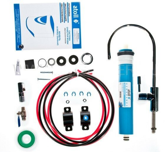 The system kit includes pre-filters Atoll MK5633C 5 µm, Atoll СK5633C, Atoll MK5633C 1 µm, atoll TW40-1812-50 membrane, post-filter Atoll CK2586C