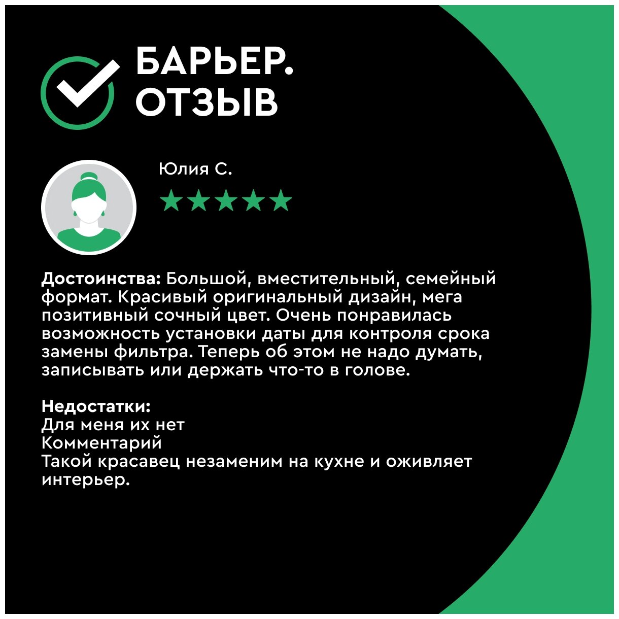 Volume of filtered water: 2 l; funnel volume: 1.7 l; compatible with all interchangeable cassettes Barrier; delivery of different configuration options is acceptable - with a “standard” cassette or a “rigidity” cassette
