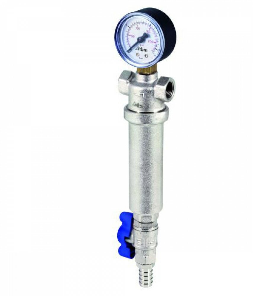 Body material: brass, connection type: socket BP/BP, nominal pressure: PN 16, cell size: 100 microns, options: pressure gauge, drain